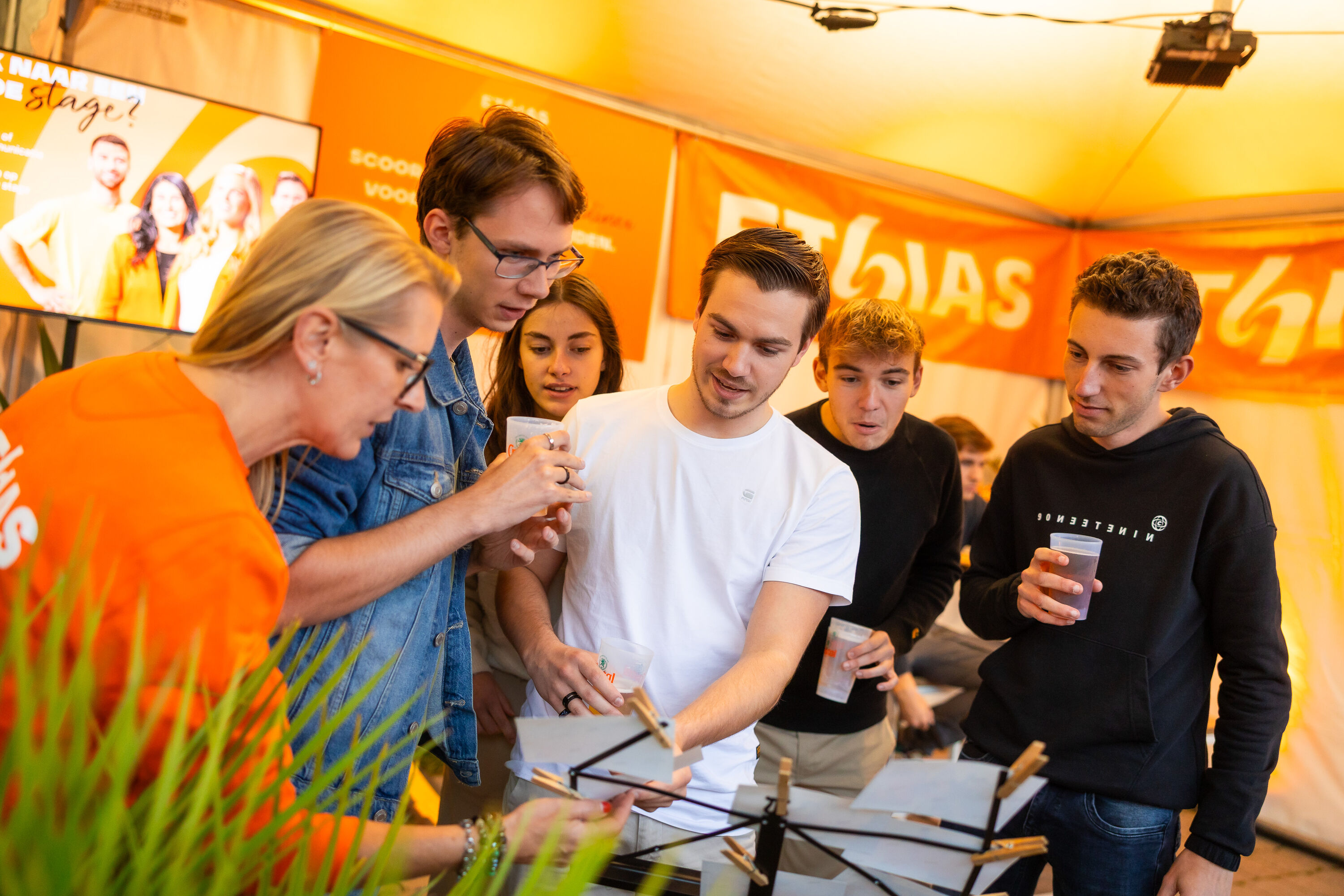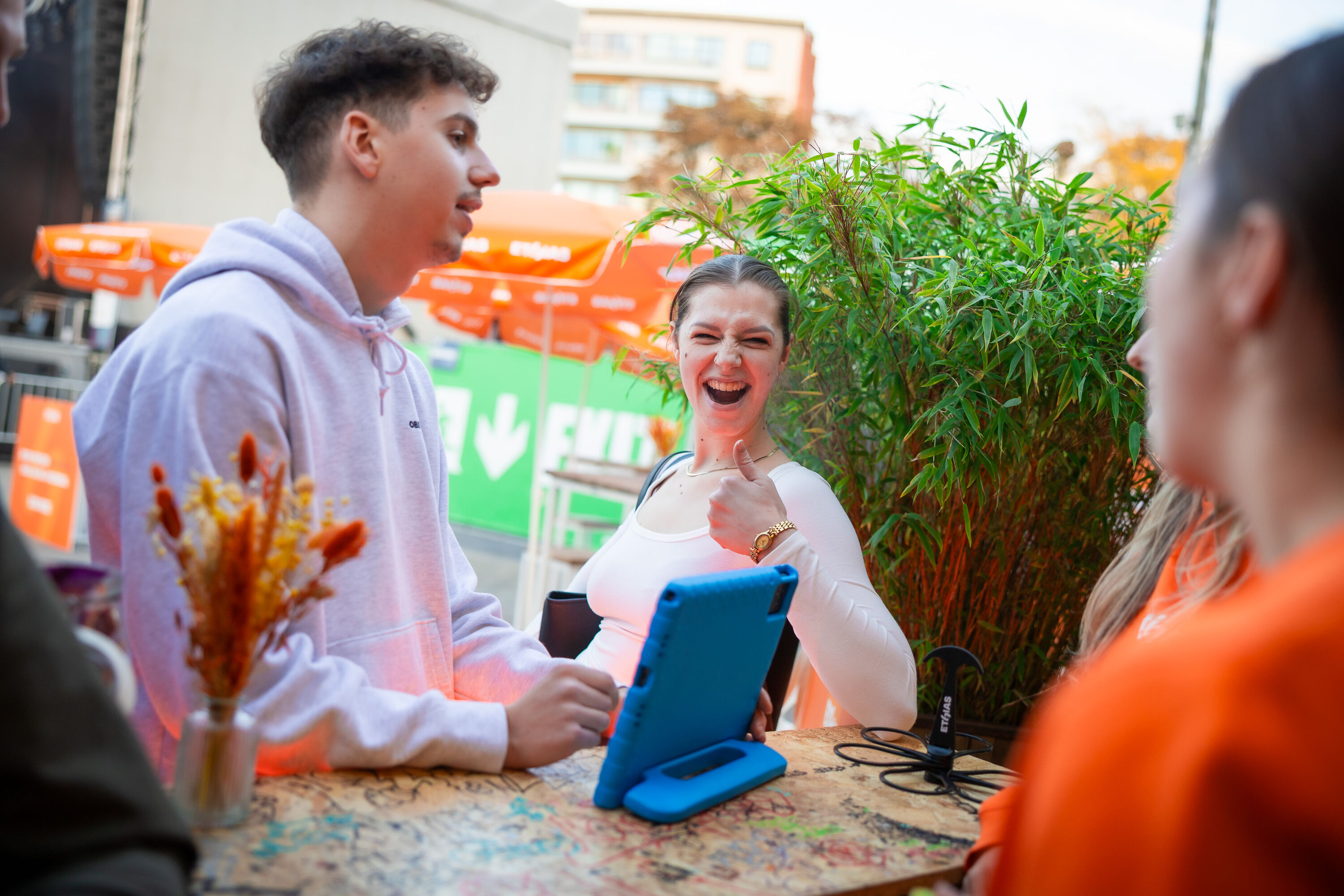 Op het Ethias-terras konden studenten daarna even ontsnappen aan de drukte. Opladen met een drankje, chillen in de zitzakken, of gewoon lachen met onze mascottes, die het terrein onveilig maakten met dansjes, selfies en stiekeme photobomb-acties. Tussendoor konden studenten ook kennismaken met onze Ethias Crew, die op een spontane, toegankelijke manier alles vertelde over hoe Ethias studenten helpt veilig en zorgeloos het academiejaar door te gaan.